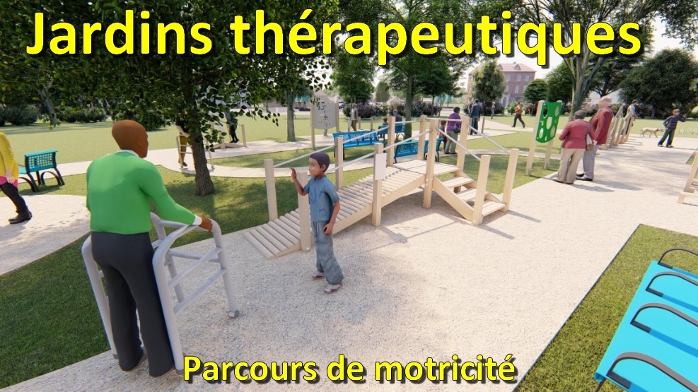 Jardin thérapeutique et Parcours d'incitation à la marche. L’aménagement d’un parcours psychomoteur doit être constitué de différents éléments mettant en jeu :La marche, l’enjambement, le franchissement, l’équilibre et les activités motrices des membres supérieurs et inférieurs..Il est important dans sa conception de prévoir aussi une animation qui permet de stimuler les différentes formes de mémoire. Vous trouverez dans le menu ci-contre à gauche l’ensemble de ces catégories y compris l’aménagement d’un lieu de convivialité avec des bancs, tables et des potagers sur pieds accessibles en fauteuil roulant.